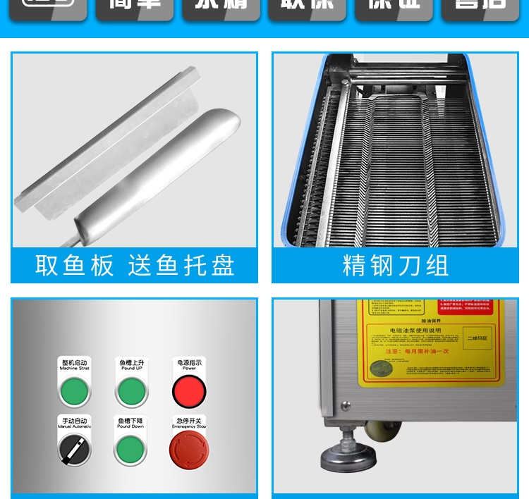 1.斜度及厚薄默认标准为35°、2.5毫米,斜度有(25°、30°、35°、40°、45°)可供选择定制,厚度可从1.8毫米到10毫米范围定制,定好规格不能调整,不能更换。斜度越小,鱼片越宽。